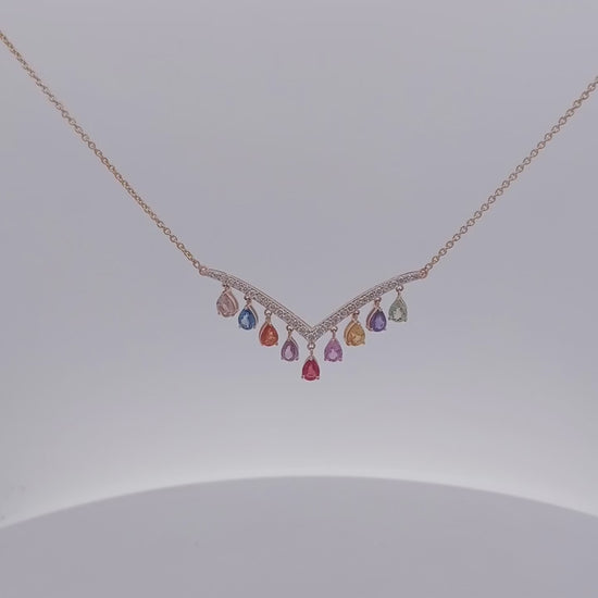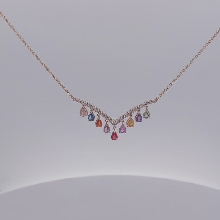 Delicate gold chain necklace featuring a graceful V-shaped design adorned with an array of vibrant, multi-colored gemstones. This elegant piece captures a playful yet refined aesthetic, making it an ideal accessory for both casual and sophisticated ensembles.