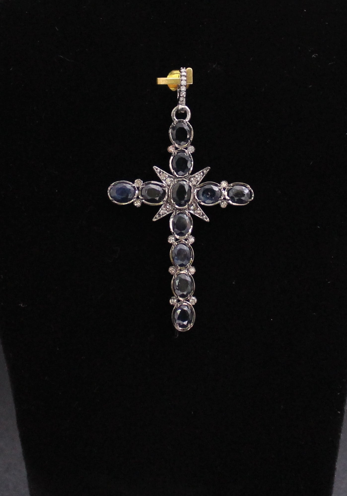 Big Cross Diamond & Blue sapphire, Ruby, Turquoise Pendant in Antique look set in Sterling Silver