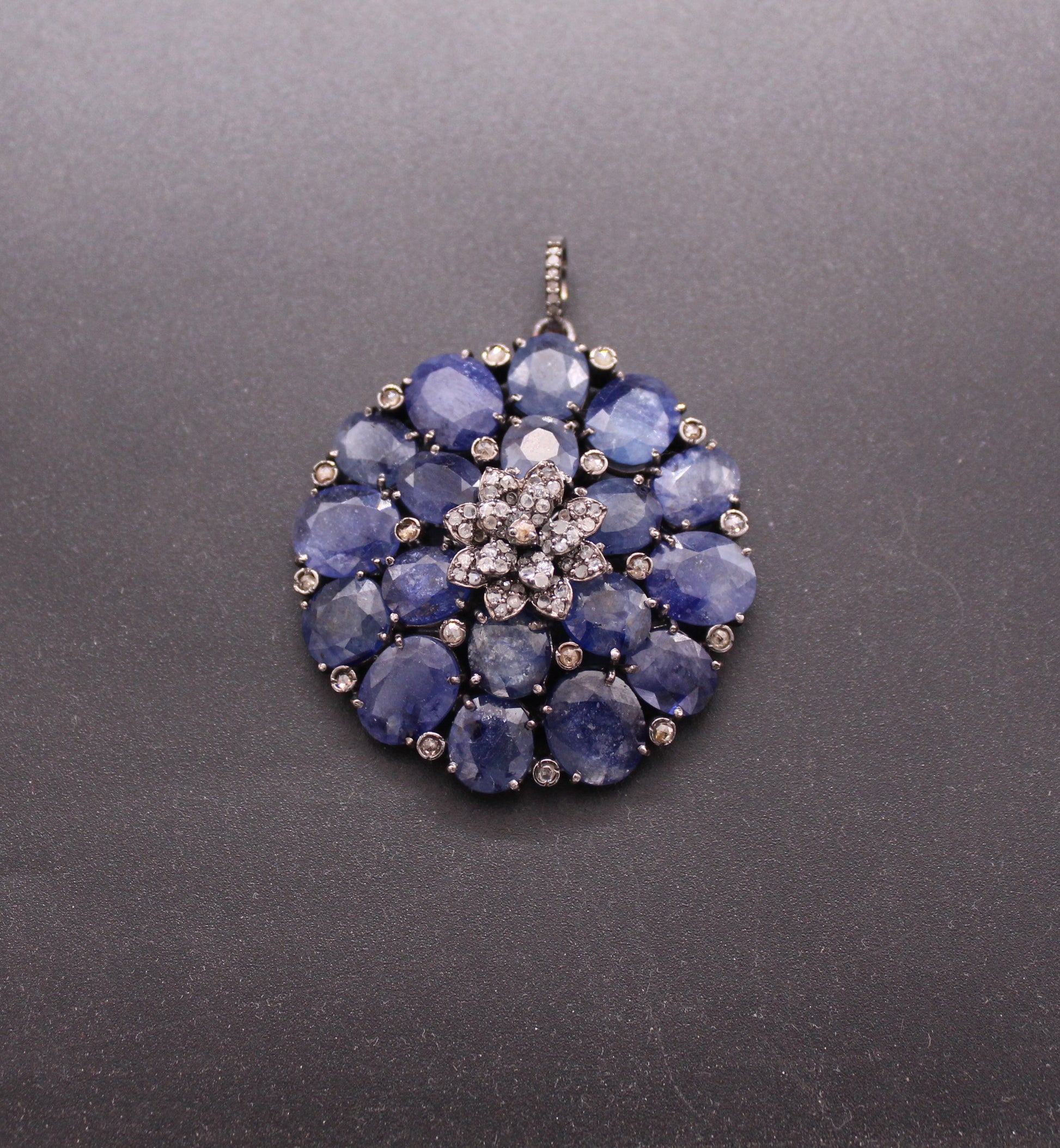 Big Flower Diamond and Blue Sapphire Pendant in Antique look set in Sterling Silver