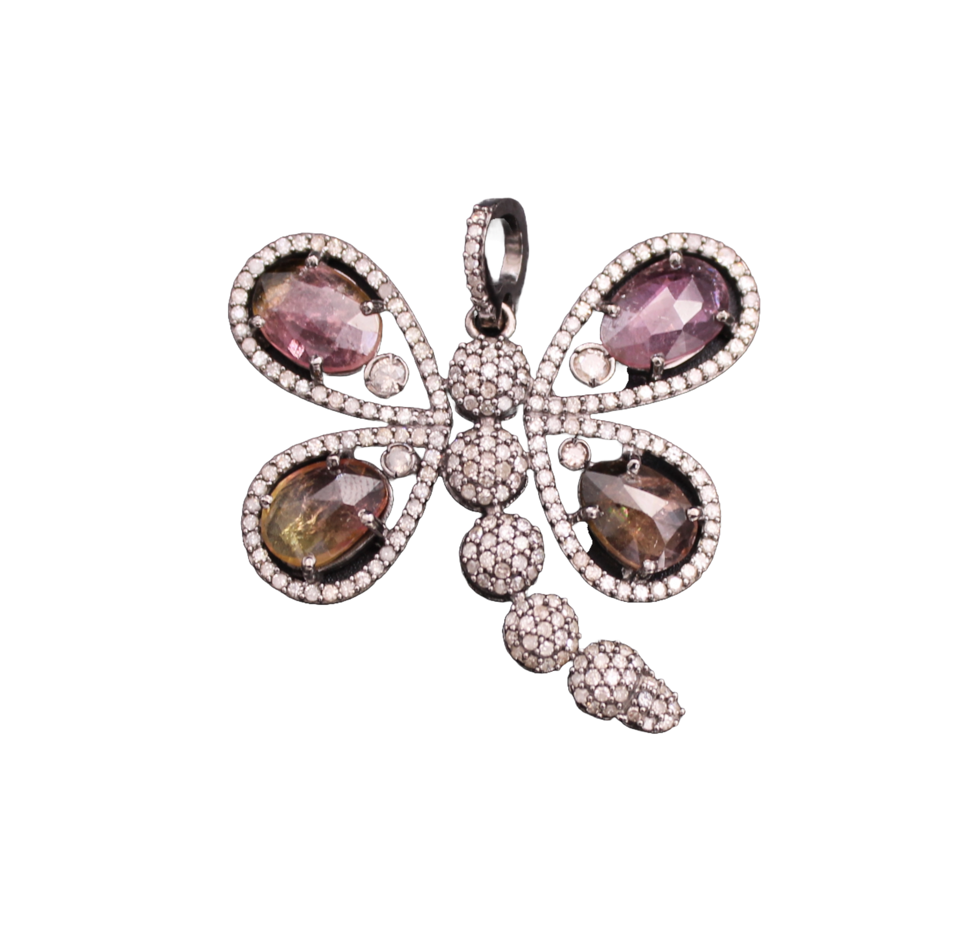 Butterfly Diamond and Multi stone Pendant in Antique look set in Sterling Silver