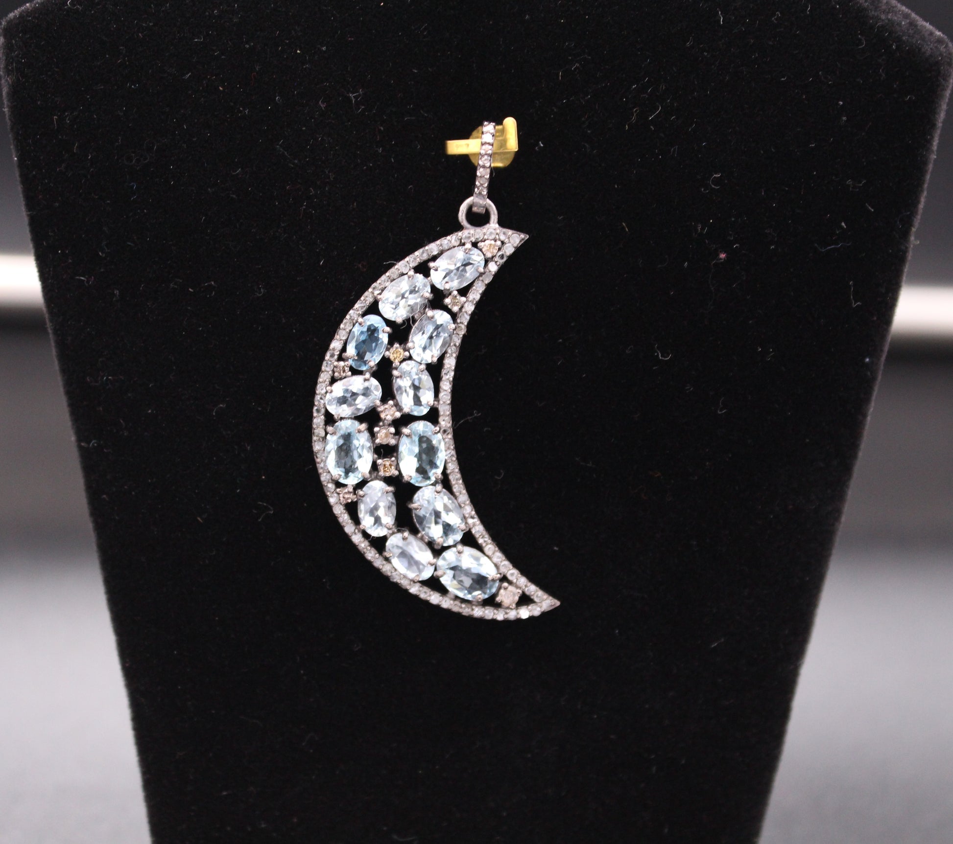 Crescent Moon Diamond & Aqua Marin and Labro Pendant in Gold Rodium look set in Sterling Sliver
