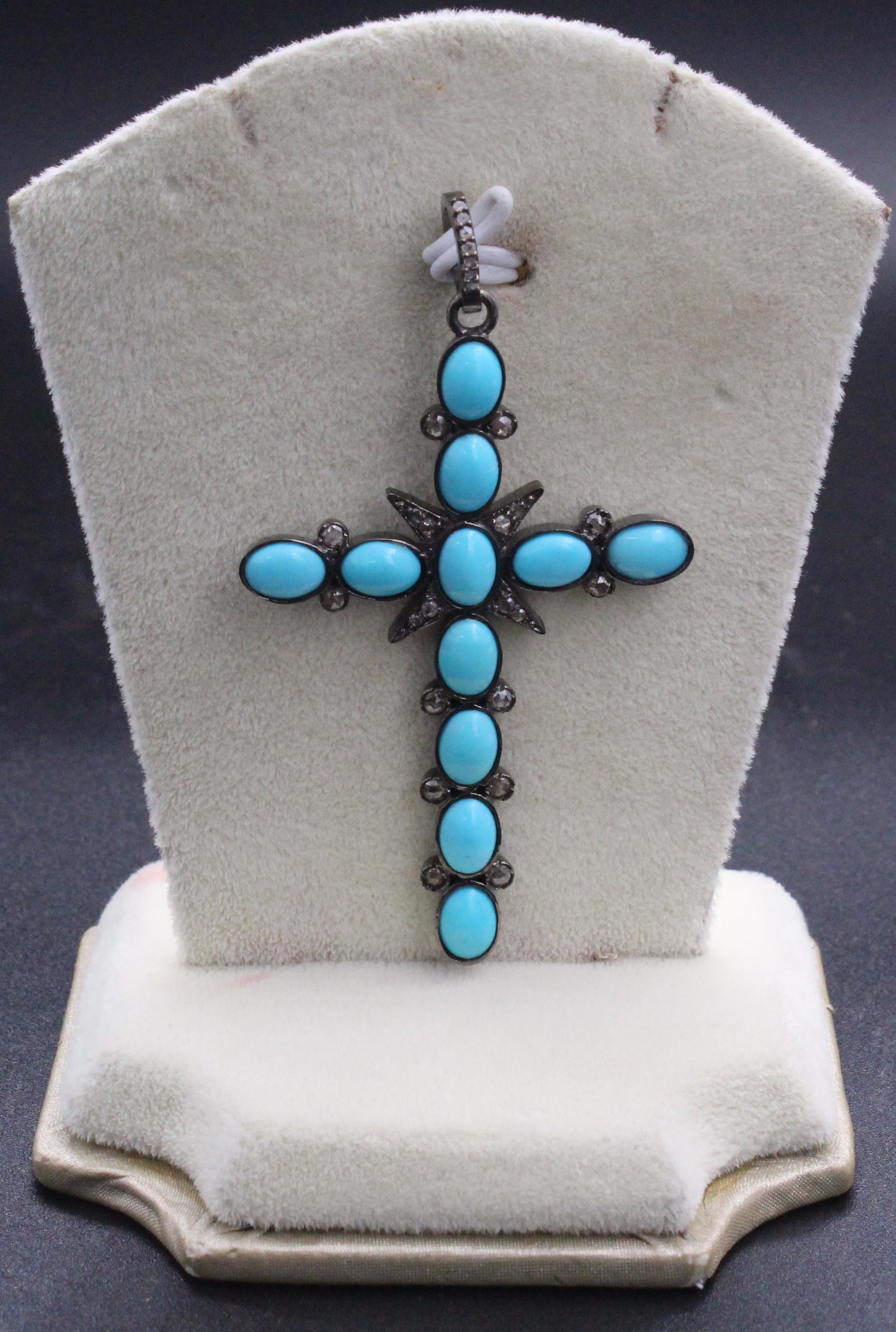 Cross Design Diamond Pendant with Turquoise in Antique look set in Sterling Silver