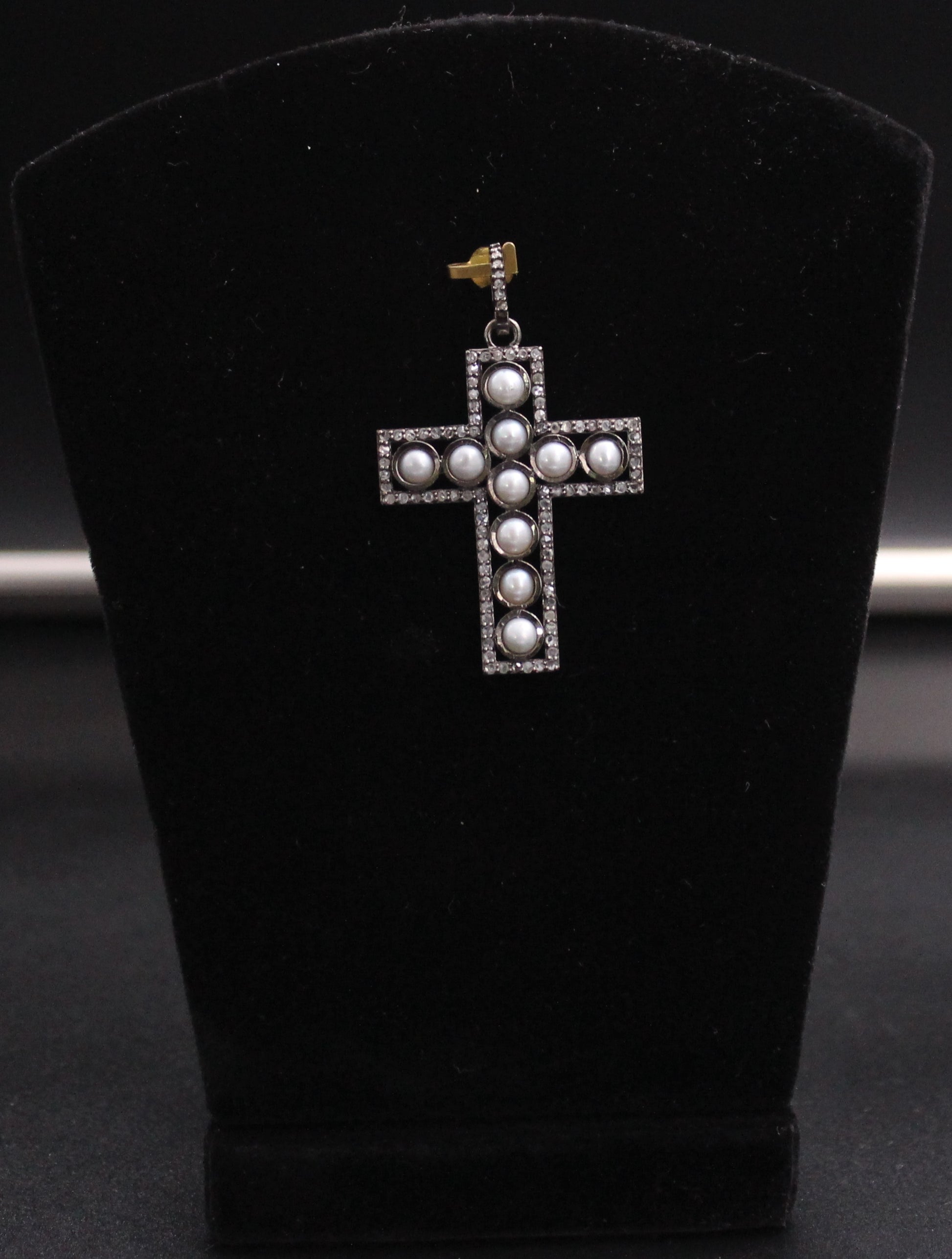 Small Cross Diamond & Pearl Pendant in Gold Rodium & Antique look set in Sterling Silver