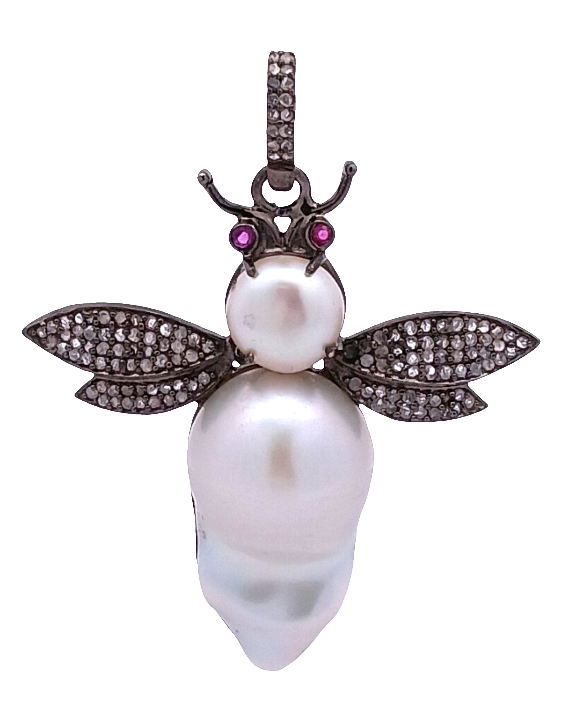 Diamond and Pearl Bee Pendant Set in Antique Look and Gold Plated in Sterling Silver Handmade