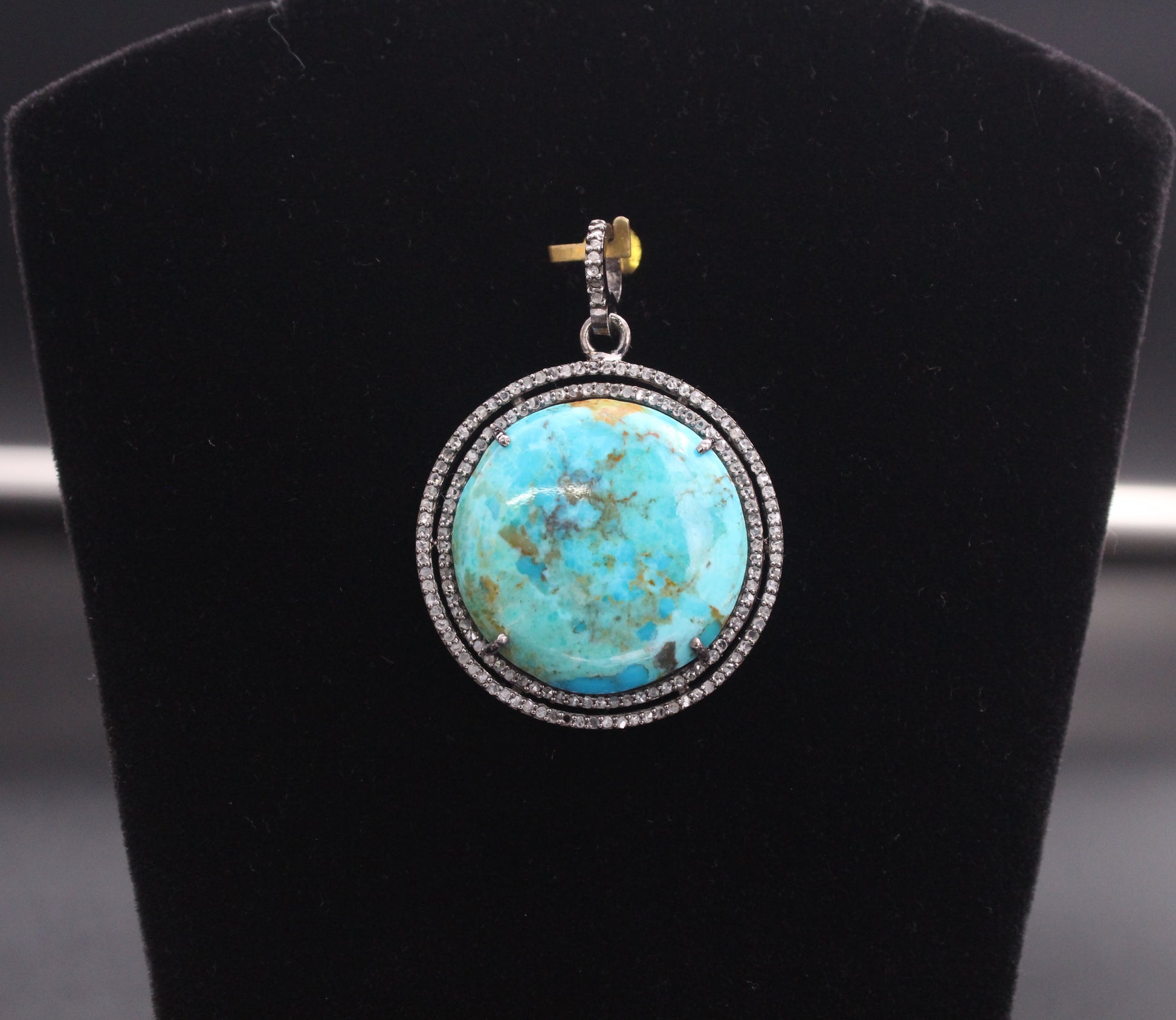 Double Raw Round Diamond & Turquoise Pendant in Antique look set in Sterling Silver