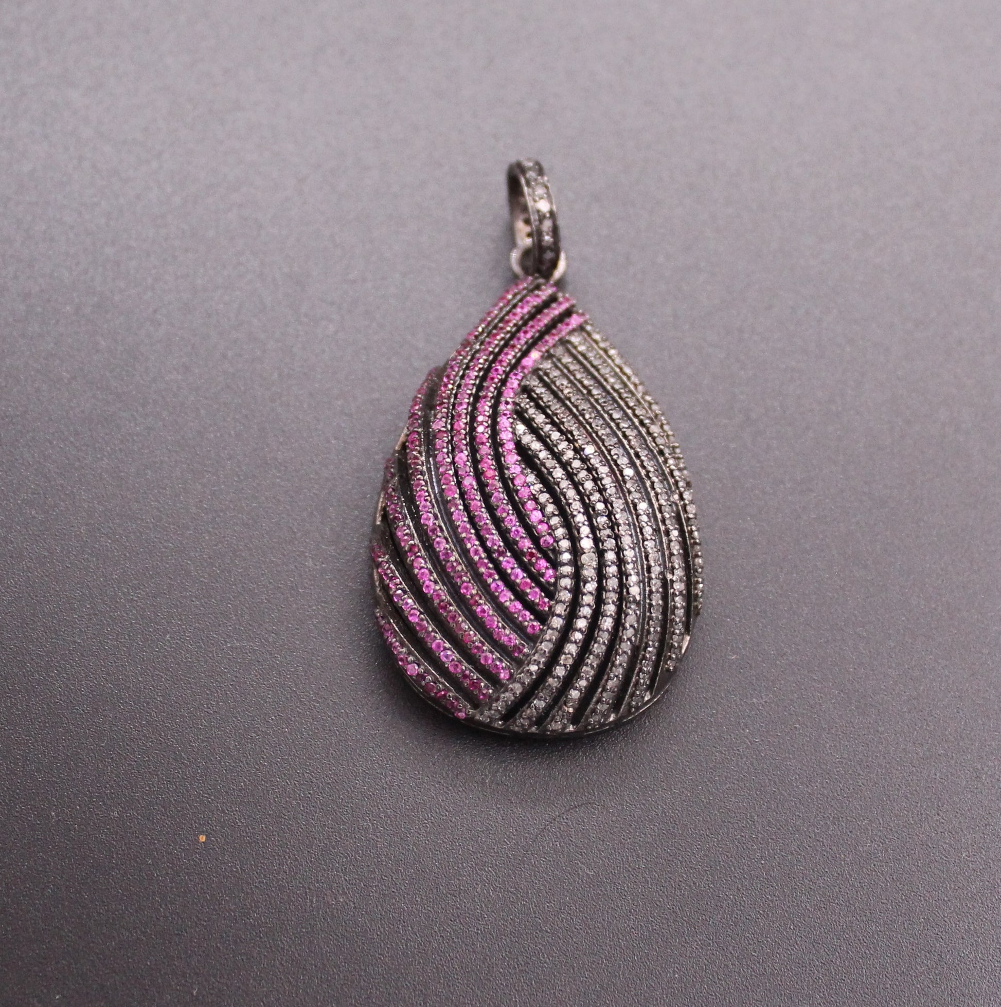 Drop Design Diamond and Ruby Pendant in Antique look set in Sterling Silver