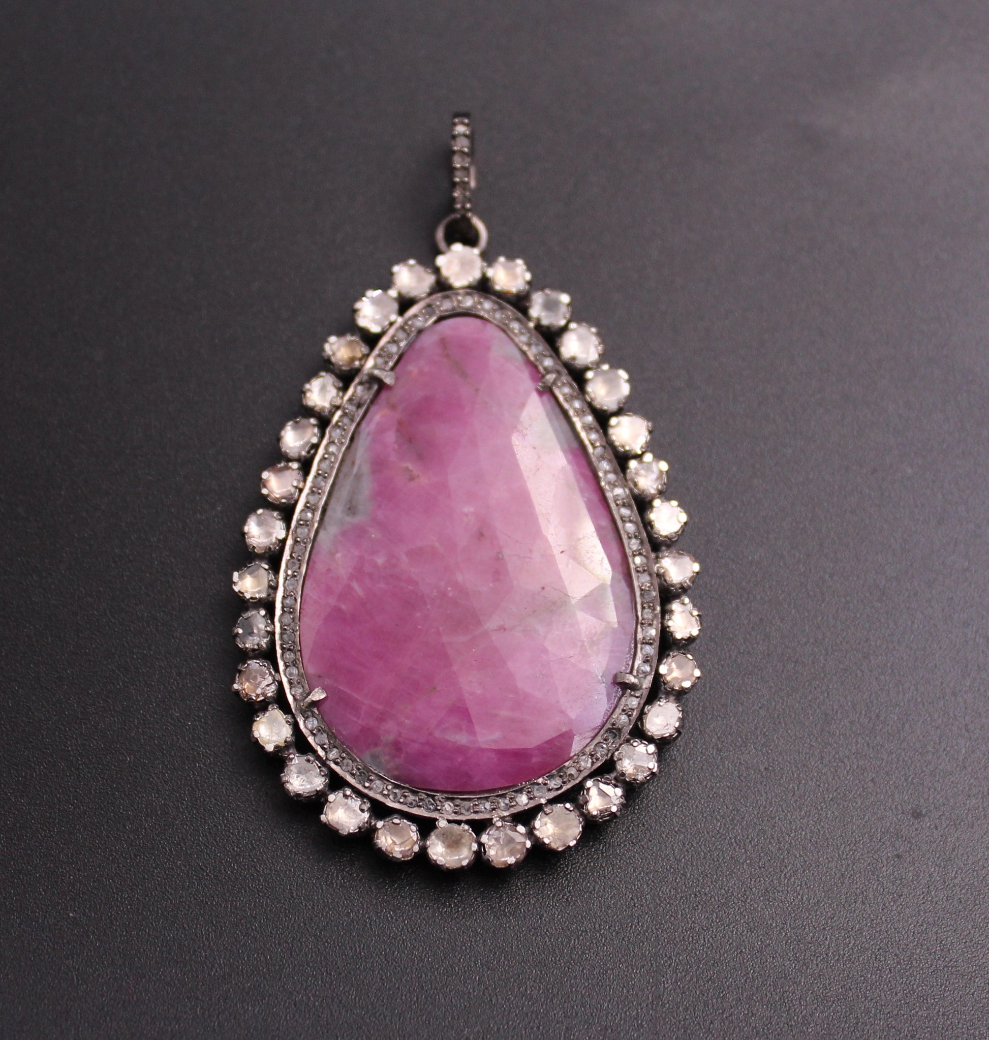 Drop Design Ruby Pendant with Polki and Diamond in Antique look set in Sterling Silver