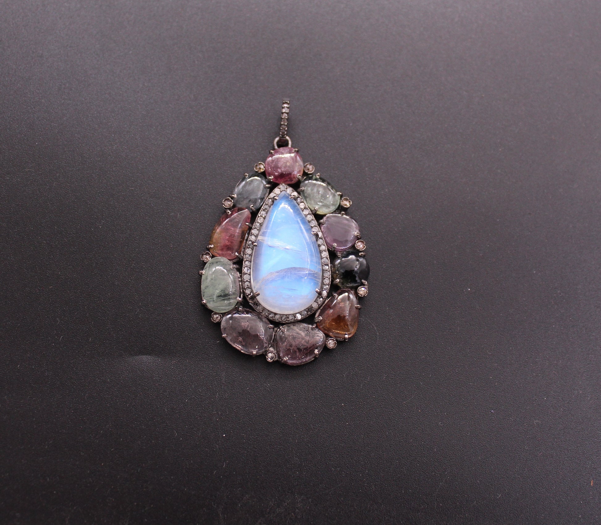 Drop Diamond With Gemstone Pendant in Antique look set in Sterling Silver