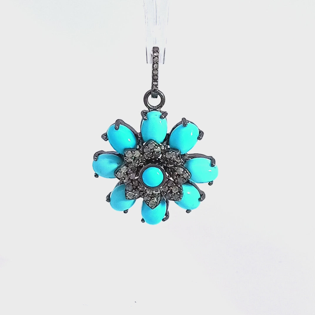 Embrace the serene allure of this distinctive pendant. Showcasing a captivating floral design, it features oval cabochon cut turquoise stones meticulously arranged. The contrasting metalwork adds a touch of intrigue to this unique piece. A perfect statement of subtle sophistication and timeless style.