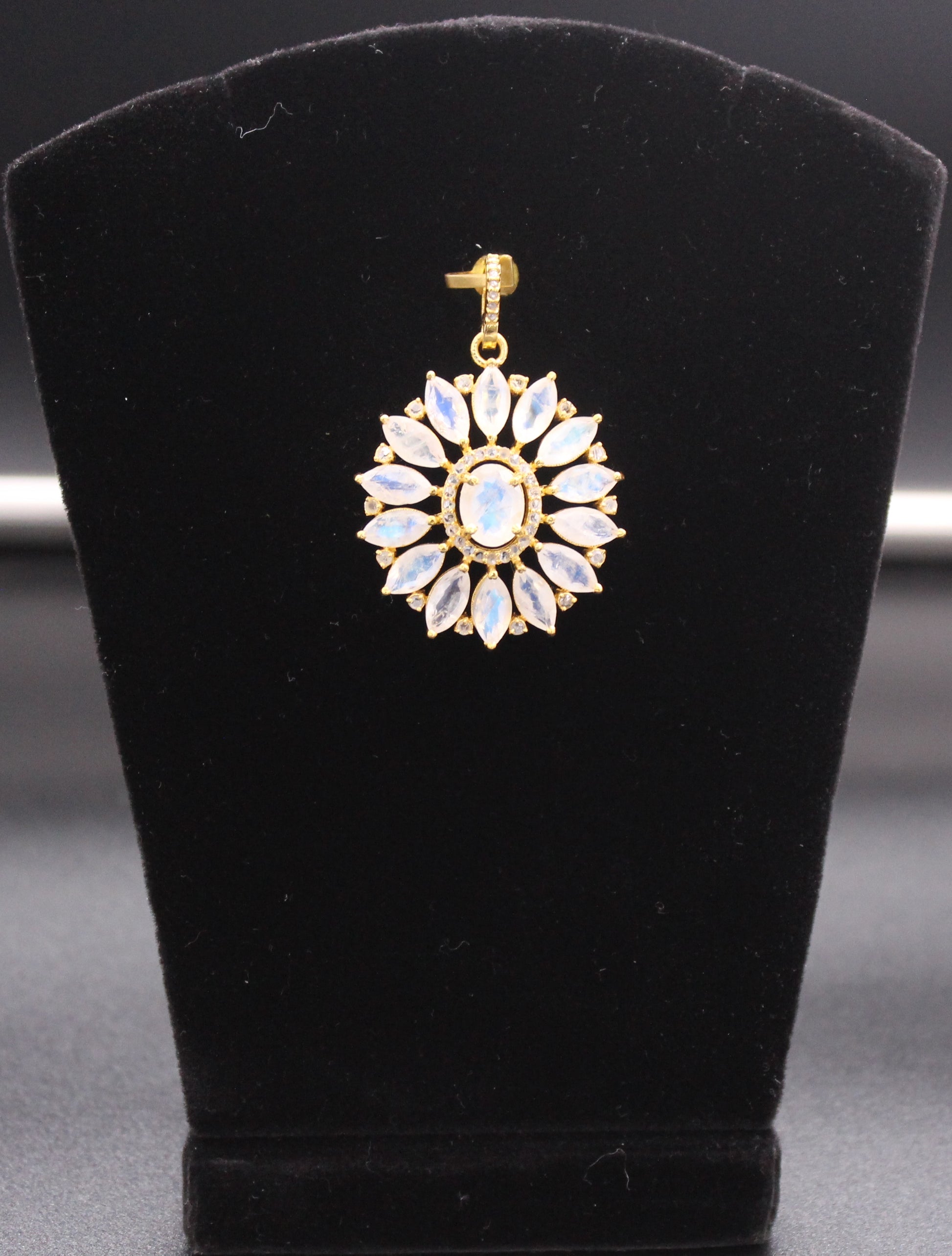 Flower Diamond & Moon Stone Pendant in Gold Rodium & Antique look set in Sterlivg Silver