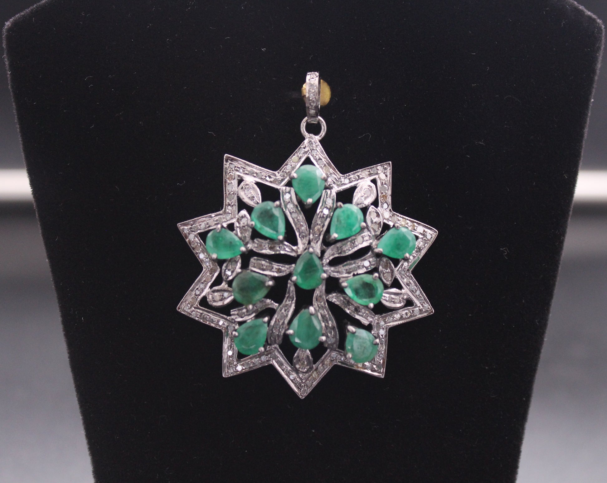Flower Diamond And Emerald Pendant in Antique look set in Sterling Silver