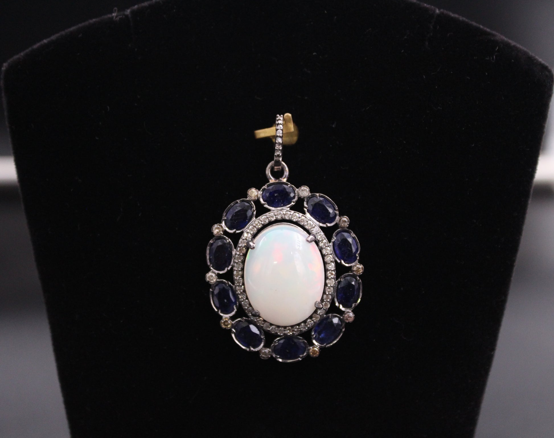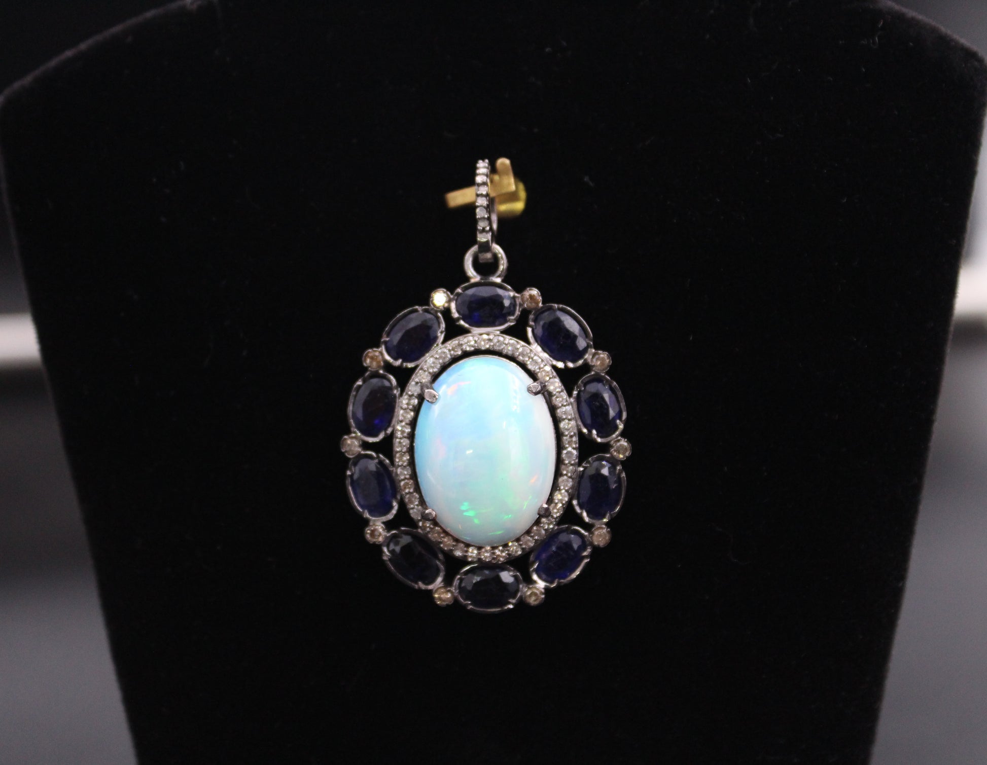 Gross weight - 8.56 Diamond weight - 0.48 Opal - 7.54 Blue Sapphire - 6.20 Size - 35mm x 27mm