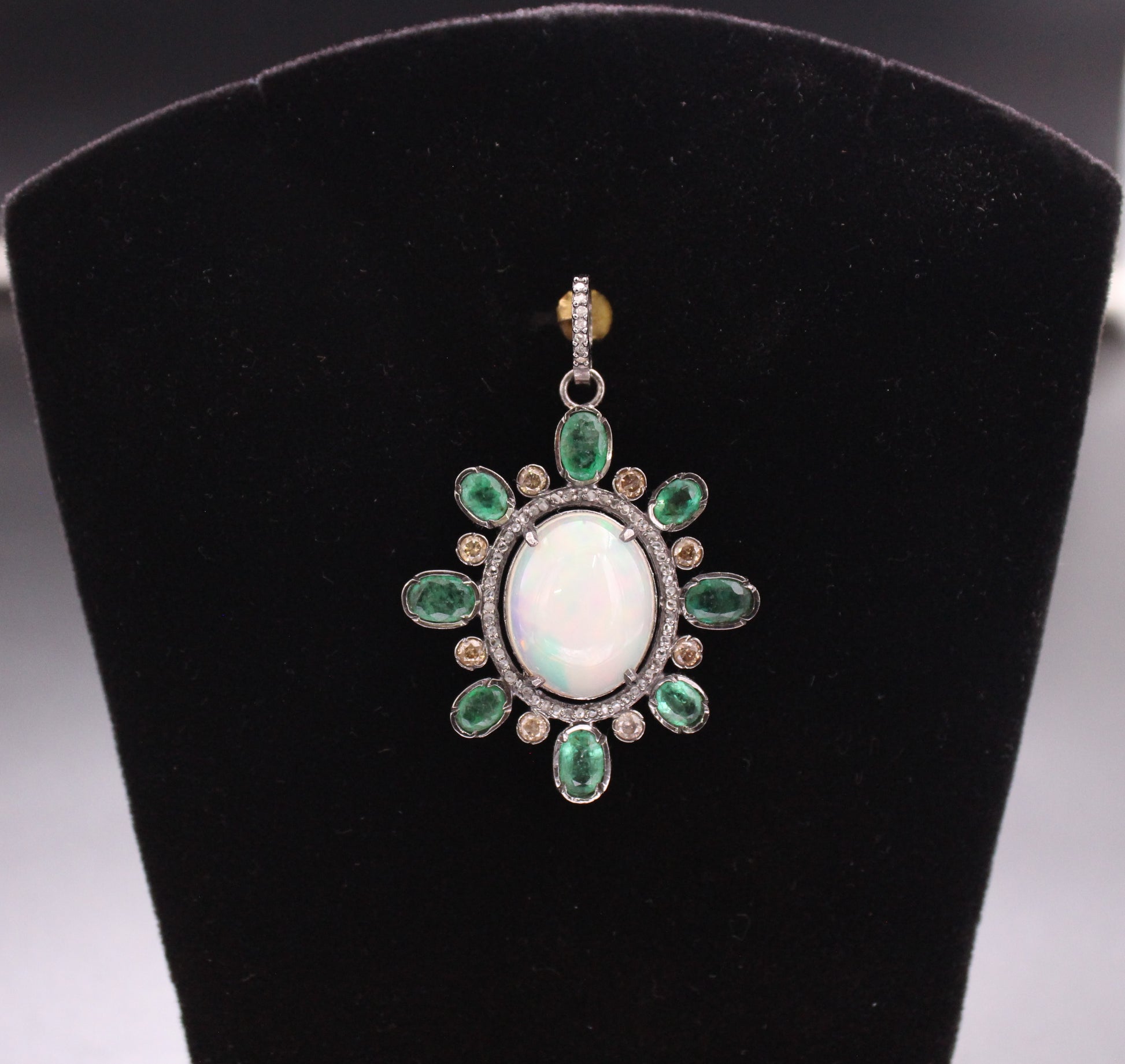 Flower Diamond & Opal With Gemstones Pendant in Antique look set in Sterling Silver