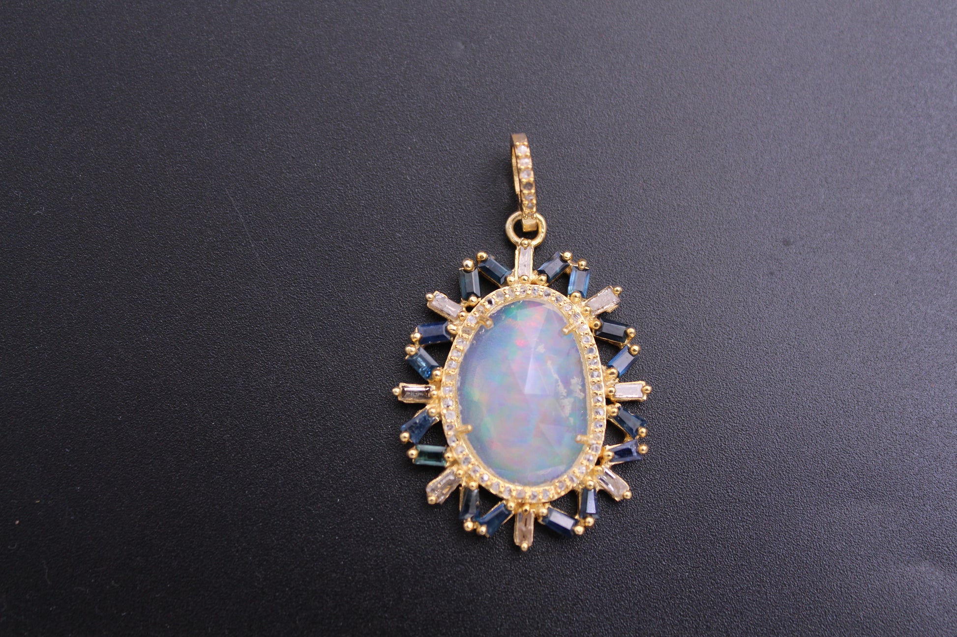 Flower Diamond or Baguette with Blue Sapphire and Opal Pendant in Gold Rodium and Antique look set in Sterling Silver