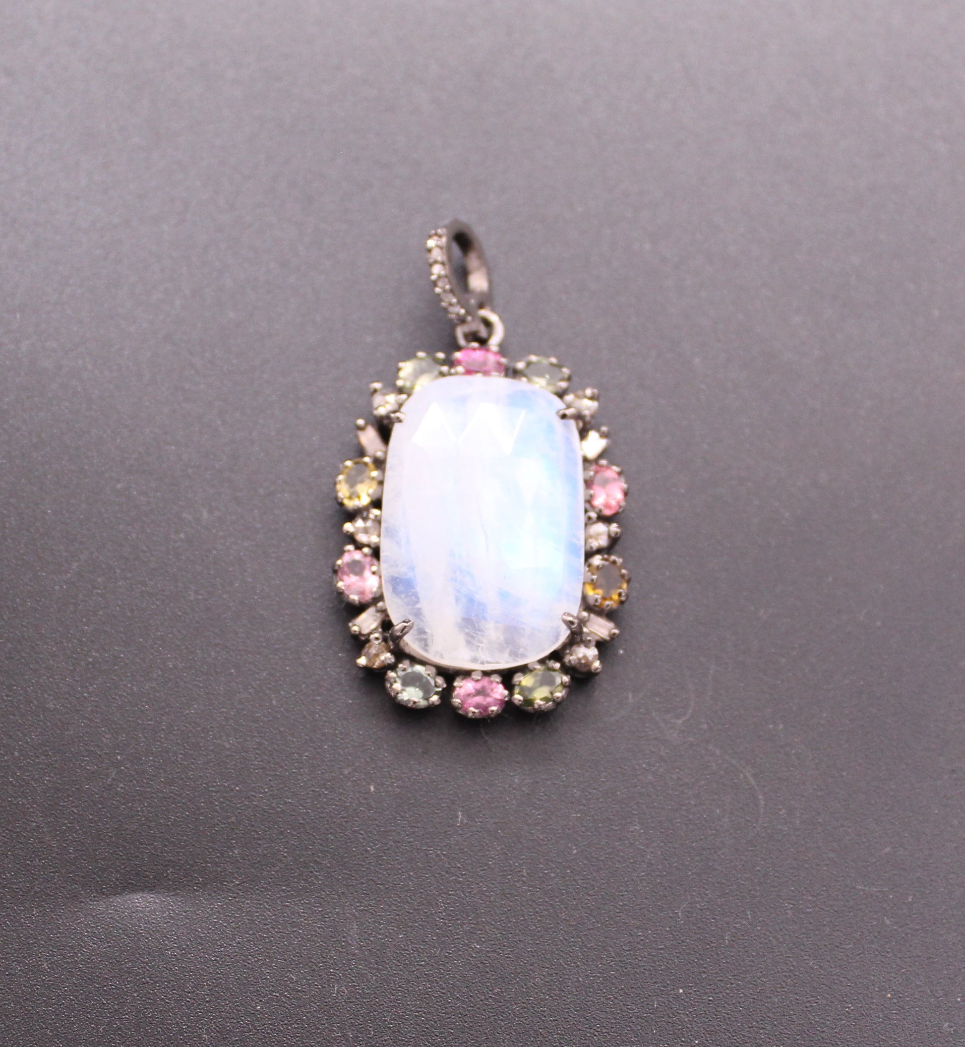 Flower Diamond With Multi Stone and Moon Stone Pendant in Antique look set in Sterling Silver