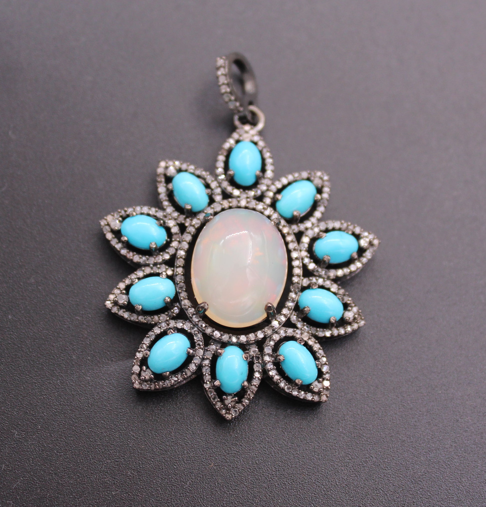 Gemstone and Diamond Flower Pendant in Antique look set in Sterling Silver