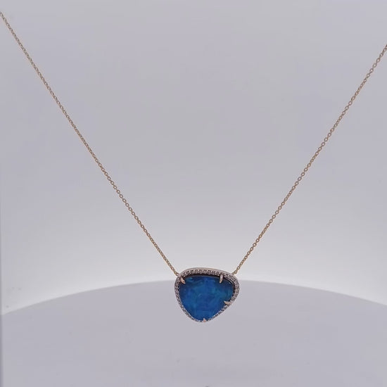 Elevate your style with this delicate yellow gold chain necklace, showcasing a mesmerizing blue opal cabochon pendant. The opal's smooth, rounded shape highlights its unique play of color, creating a captivating and elegant statement piece suitable for any occasion.