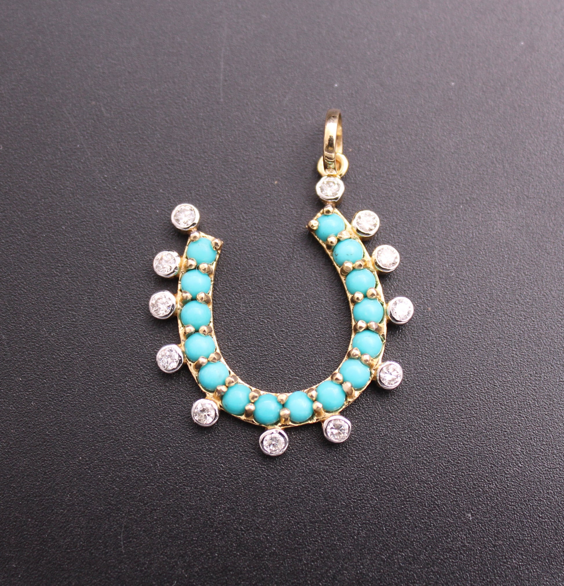 Gold Horse Shoe Diamond and Turquoise Pendant