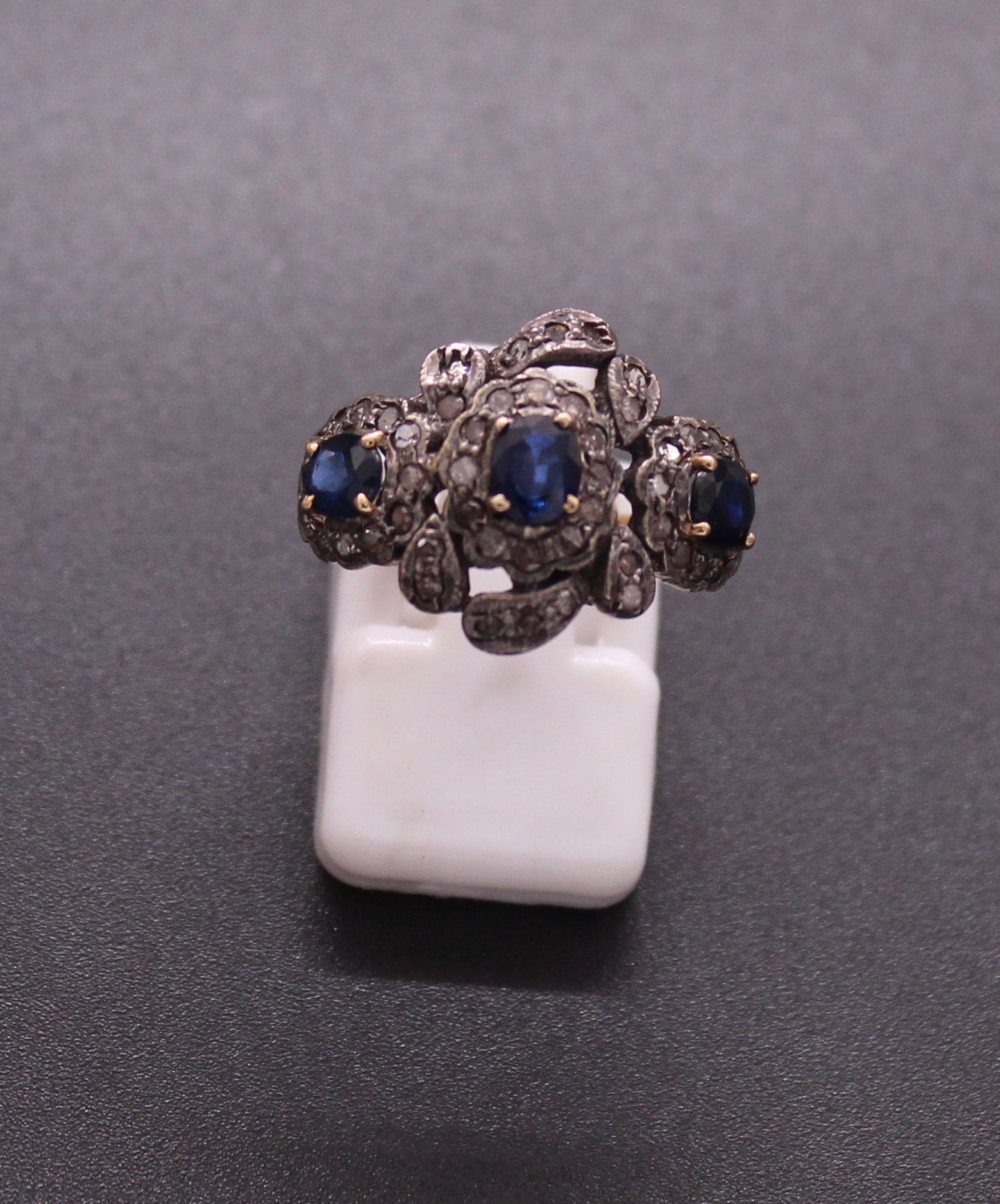 Gold & Silver Diamond and Blue Sapphire Ring in Antique look set in Sterling Silver