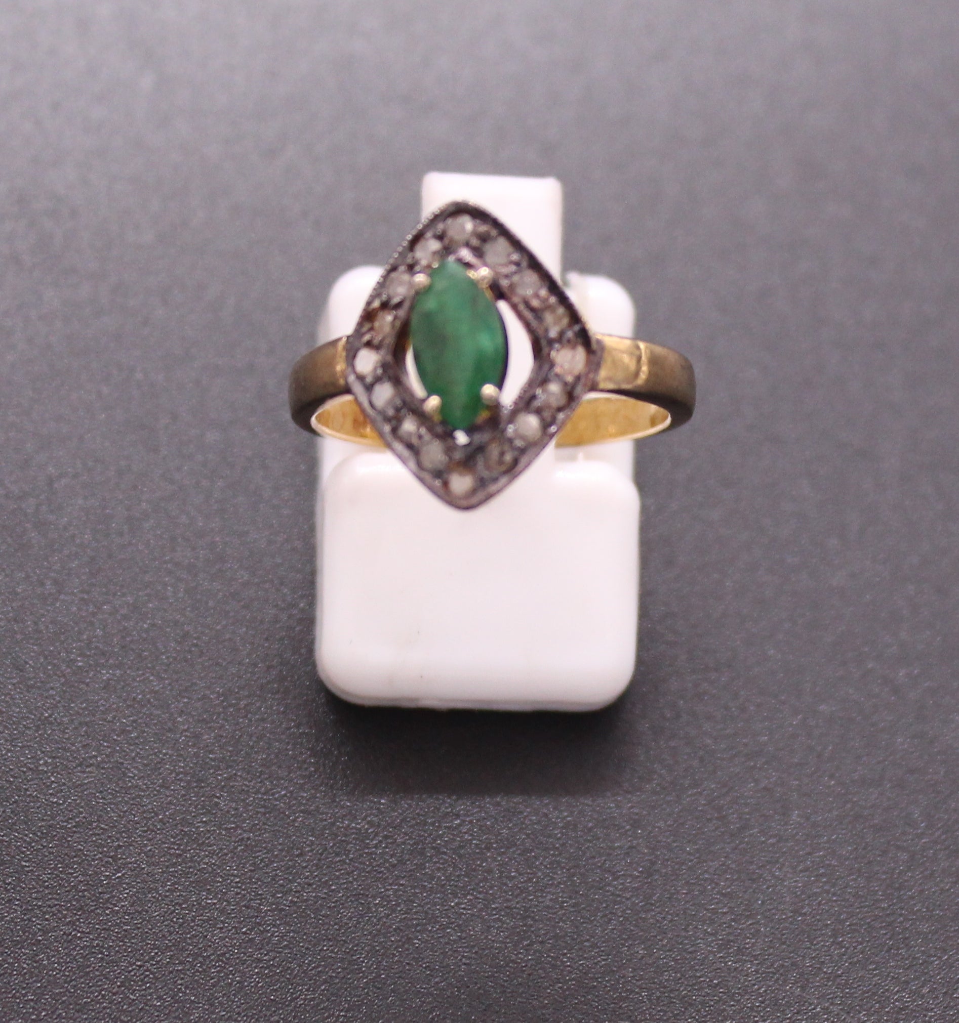 Gold & Silver Diamond and Emerald Ring in Antique look set in Sterling Silver