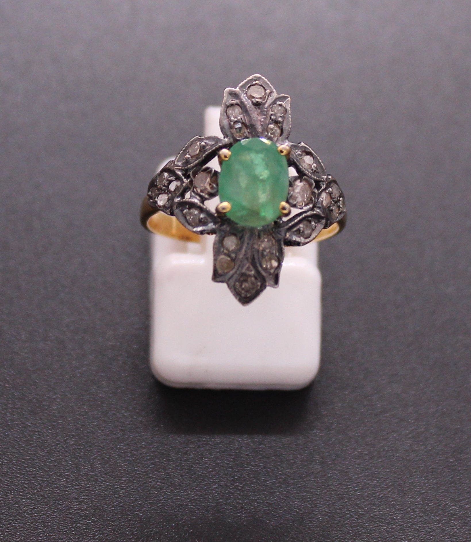 Gold & Silver Diamond and Emerald Ring in Antique look set in Sterling Silver