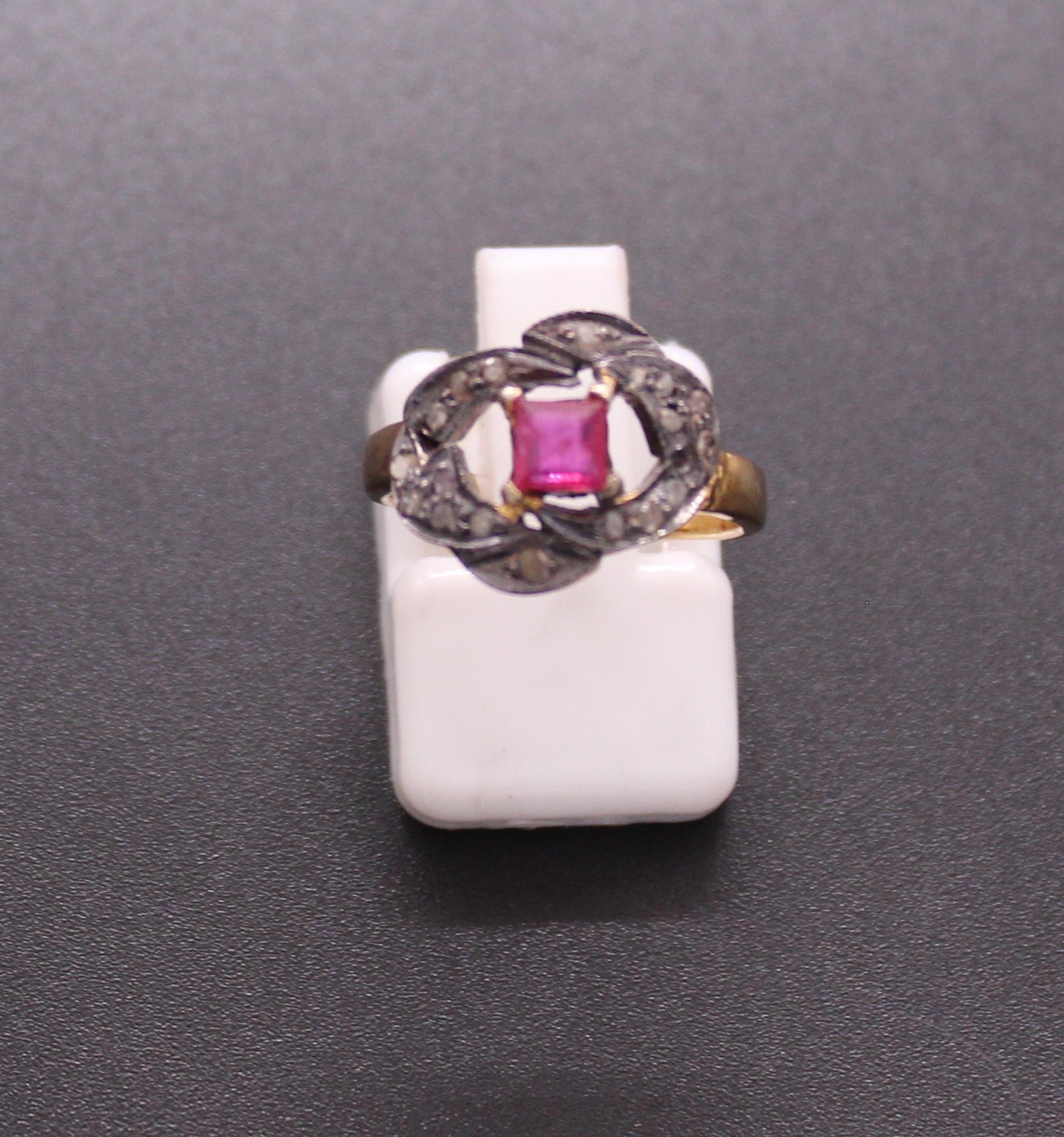 Gold & Silver Diamond and Ruby Ring in Antique look set in Sterling Silver