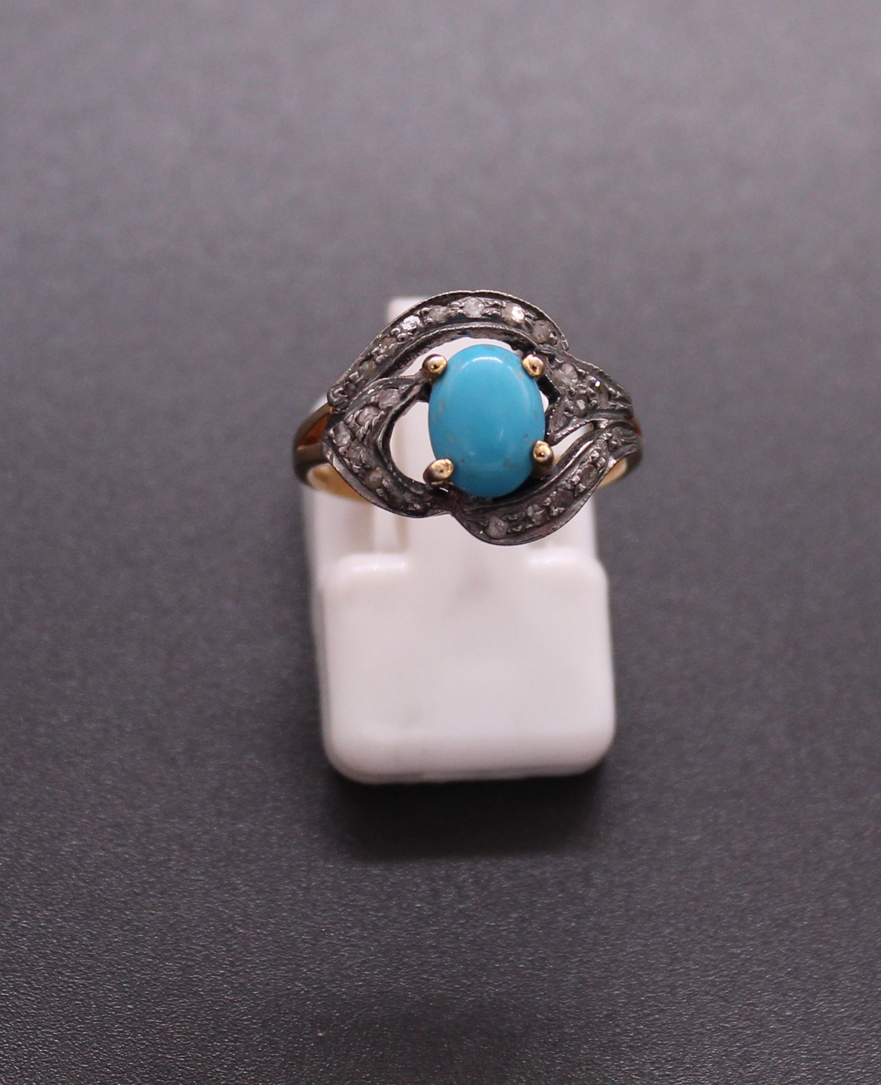 Gold & Silver Diamond and Turquoise Ring in Antique look set in Sterling Silver