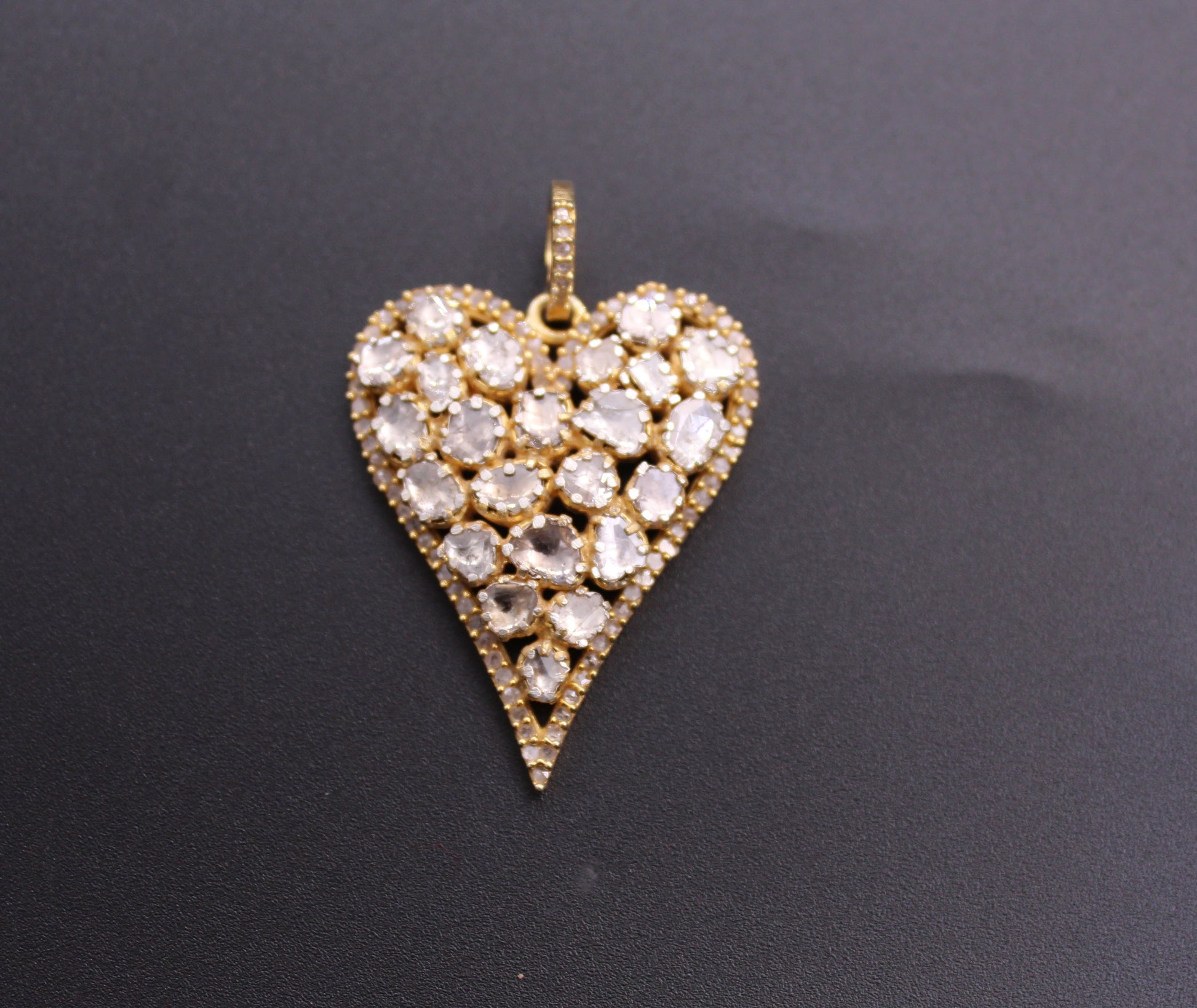 Heart Design Pendant with Diamond and Polki in Gold Rodium or Antique look set in Sterling Silver