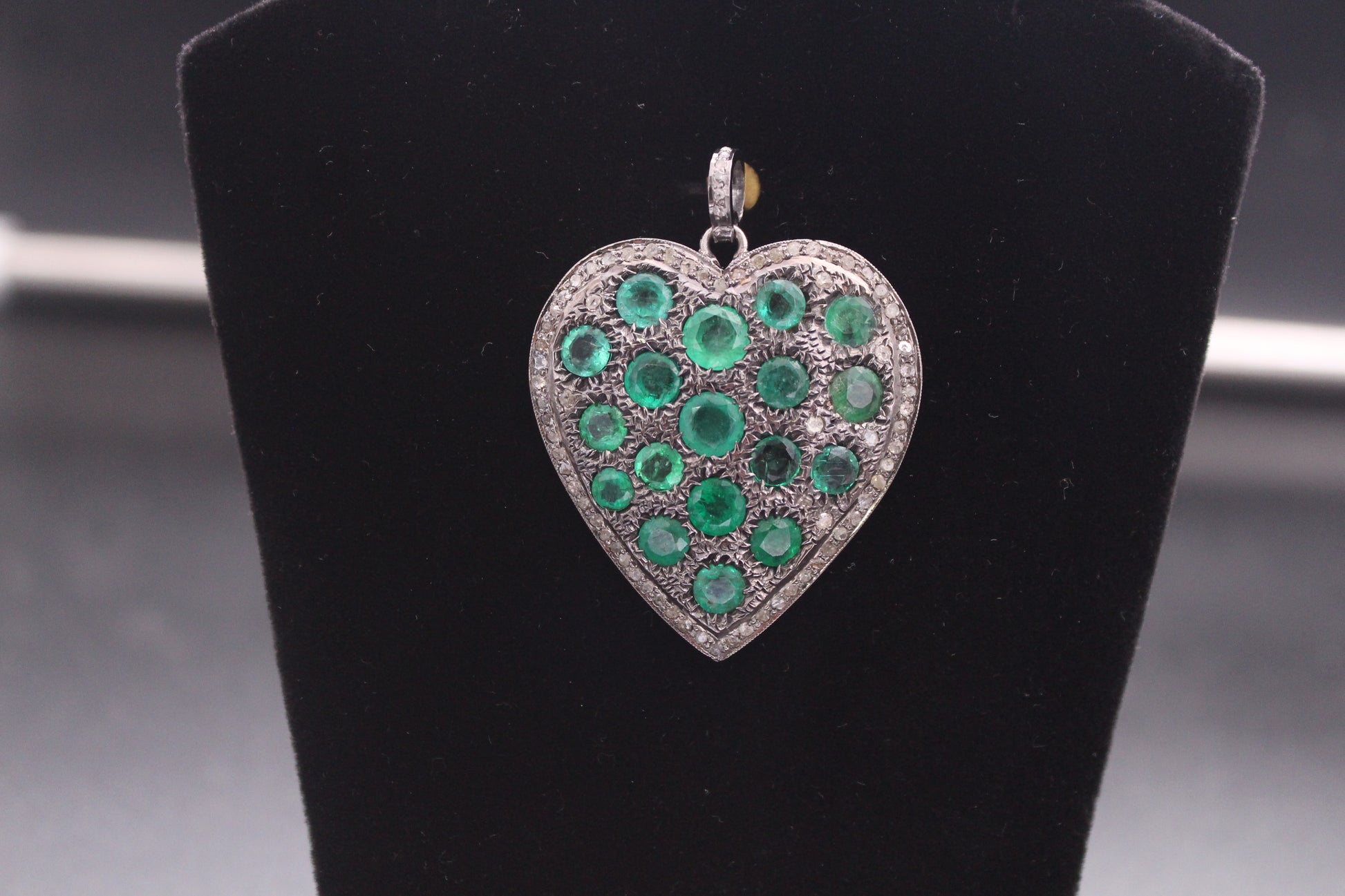 Heart Diamond & EM Pendant in Antique look set in Sterling Silver