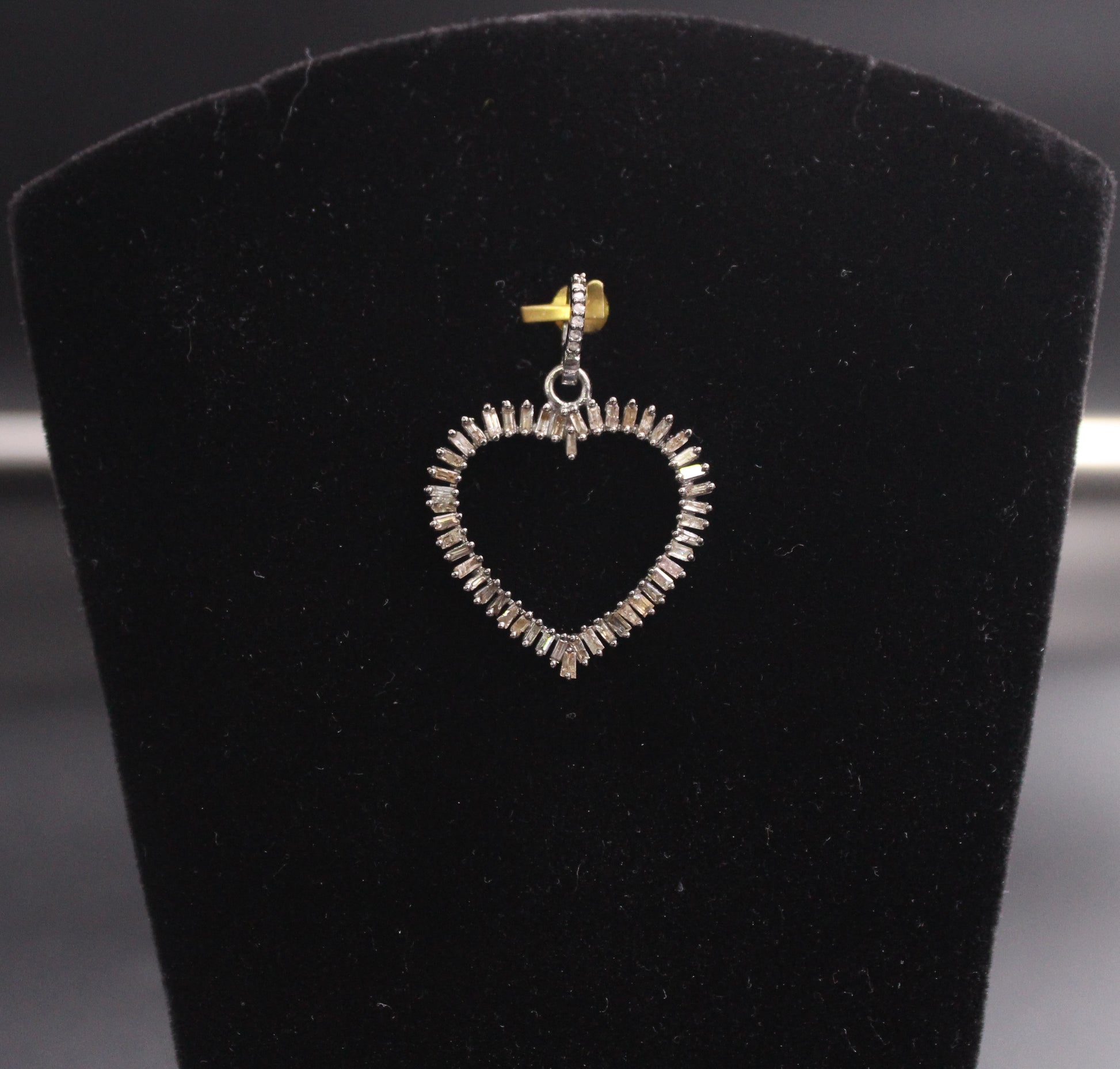 Open Heart Diamond Baguette Pendant in Antique look set in Sterling Silver