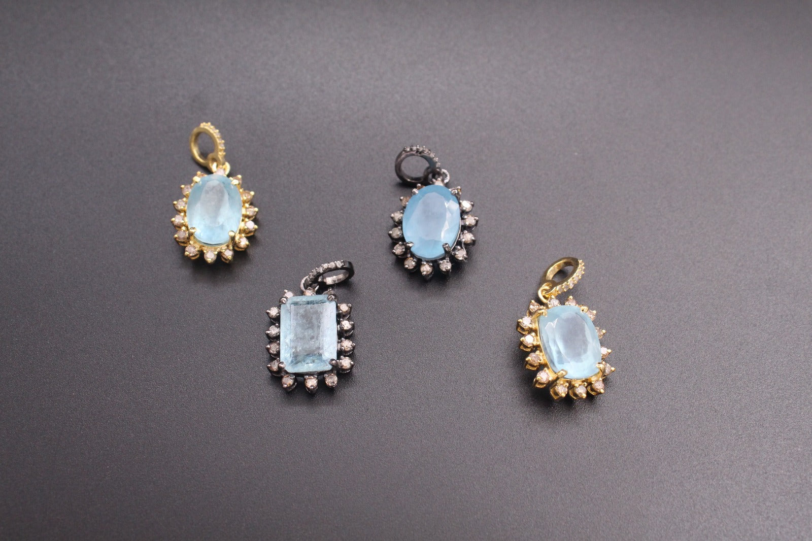 Rectangle or Oval Design Pendant with Diamond and Aqua Marine in Gold Rodium and Antique look set in Sterling Silver