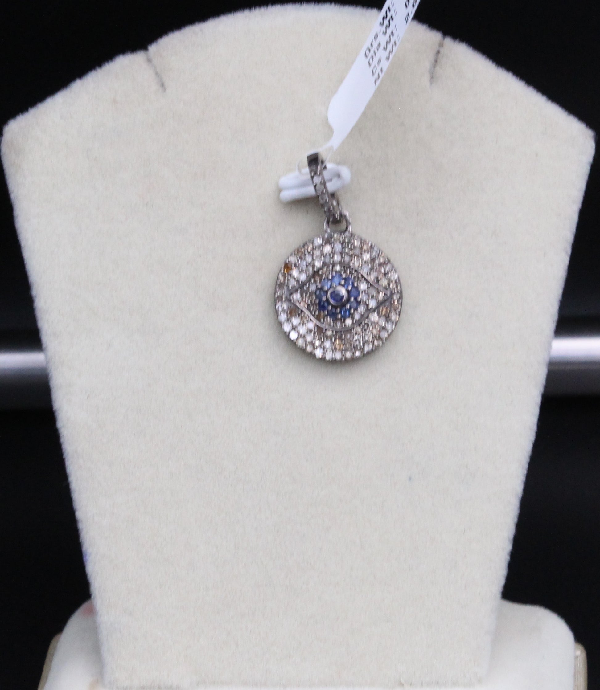 Round Evil Eye Diamond & Blue Sapphire Pendant in Antique look set in Sterling Sliver