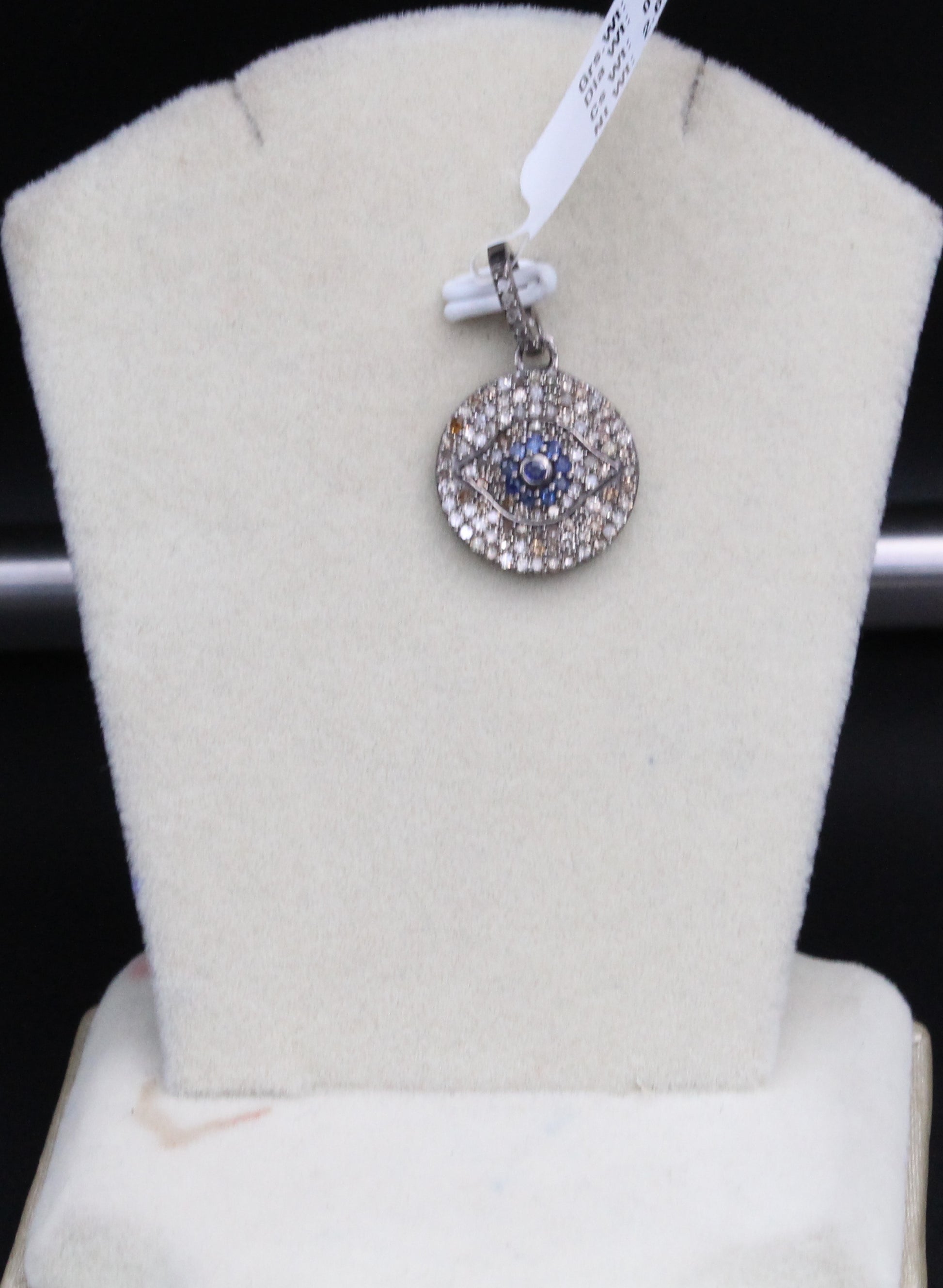 Round Evil Eye Pendant With Diamond & Blue Sapphire in Antique look set in Sterling Sliver