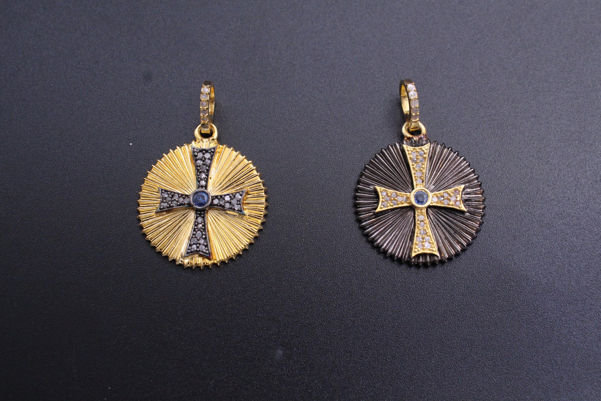 Round with Cross Diamond & Blue Sapphire Pendant in Antique & Gold Rodium look set in Sterling Silver
