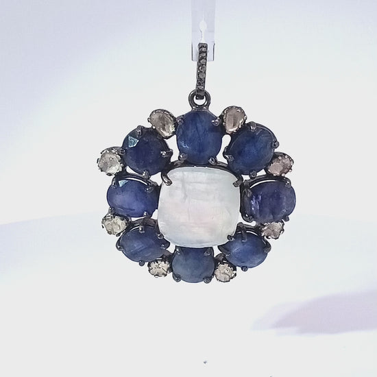 This enchanting pendant showcases a luminous, round cabochon-cut moonstone at its center, exuding a captivating glow. The sterling silver setting and distinctive arrangement complement the ethereal gemstone, creating a unique and eye-catching piece.