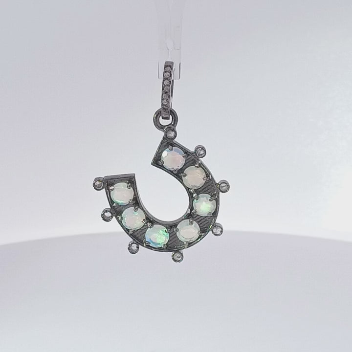 Embrace a touch of whimsical elegance with this horseshoe pendant, meticulously crafted from an unidentified base metal with a silver finish. A succession of round cabochon cut opals, turquoise and blue sapphires delicately accentuates the curve, exhibiting the serene beauty of the iridescent gemstone. A refined charm to elevate any ensemble.