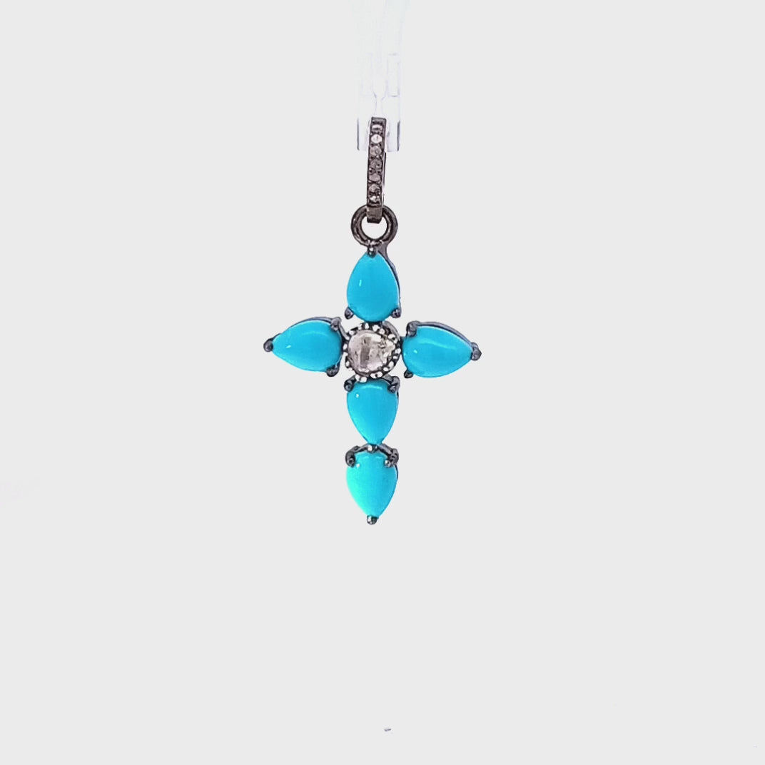 Turquoise, Polki Diamond Cross Charm in Sterling Silver Handmade